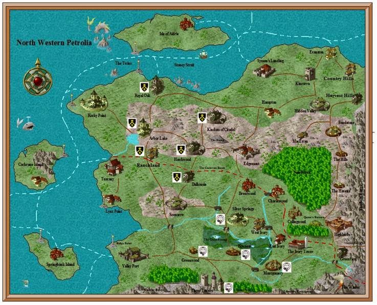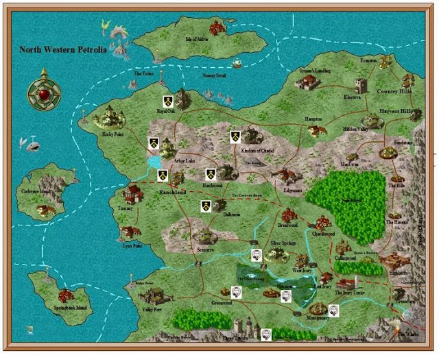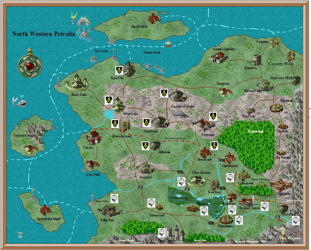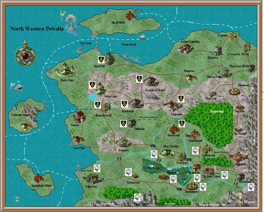 would not extend along shipping lanes; it would be necessary to fight some type naval battle to conquer the islands. The sea-lanes have an advantage, though, in that they directly connect most of the coastal and island settlements, so a naval force setting out from Valley Port could attack anywhere on the north or west coast.
