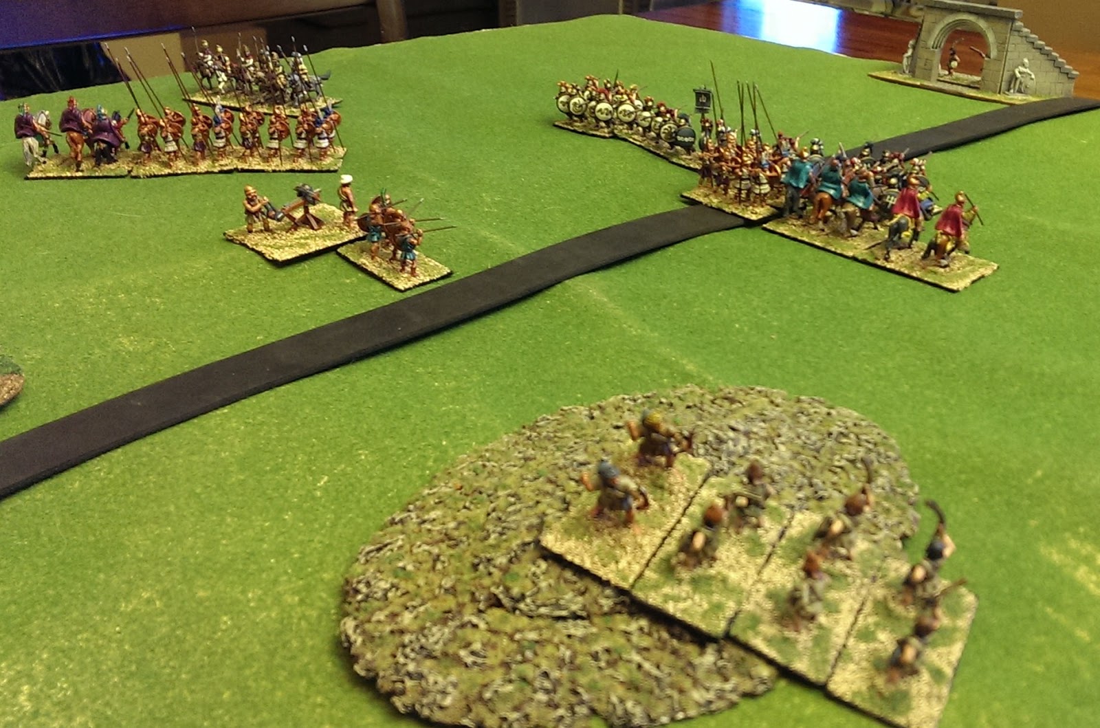 This game was another of the DBA matches. King Daniel and I both played Macedonian Successor forces, since he had recently completed painting his first DBA army (Alexandrian Macedonian) and I loaned him an elephant to make it into something a little more exotic.